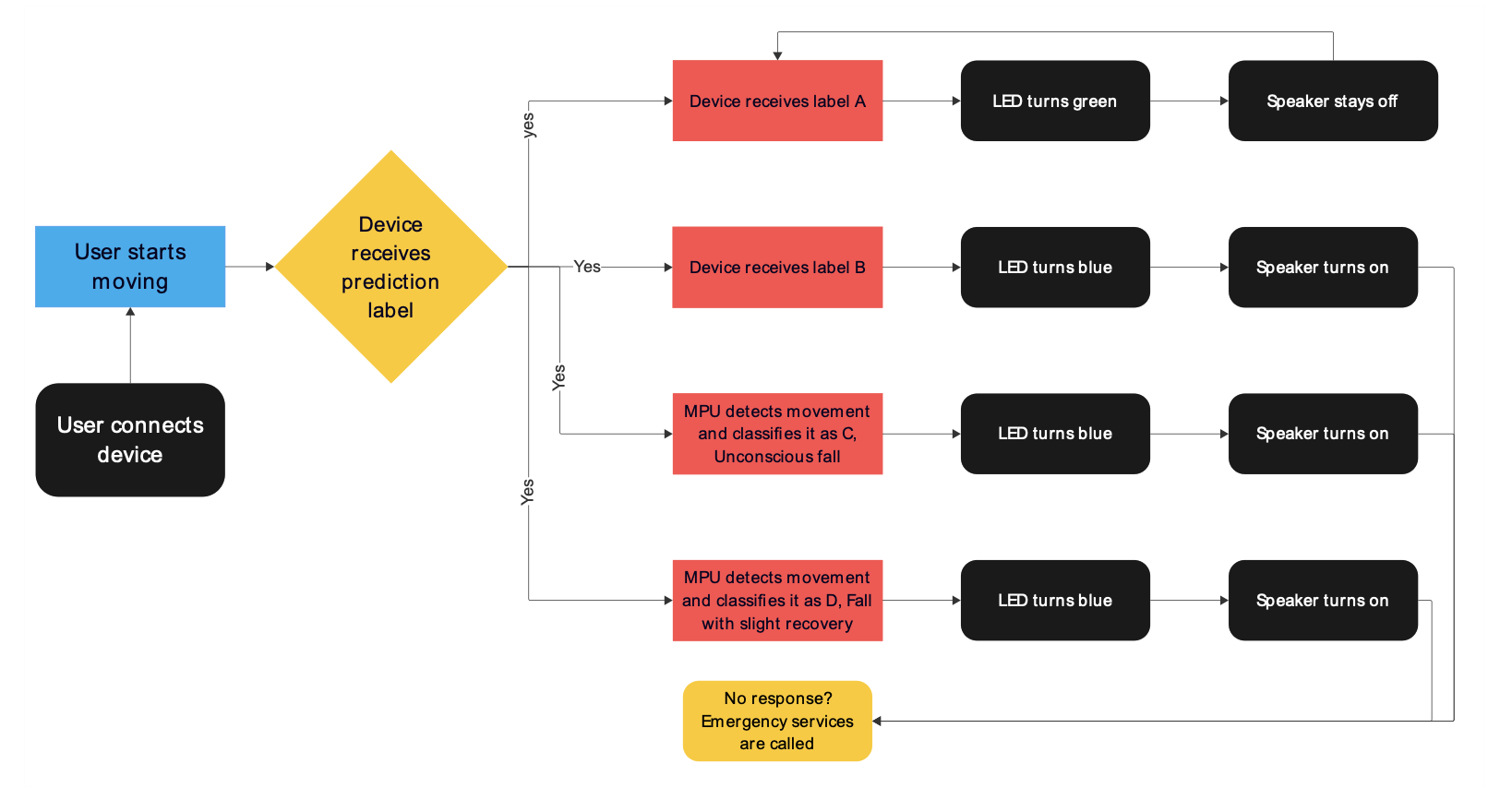 In response to this pressing issue, FallSense has been developed as an intelligent interactive product designed to detect types of falls among the elderly and notify the appropriate emergency services. FallSense addresses the critical need for a reliable and efficient fall detection system that not only ensures rapid response but also provides immediate reassurance to the user through visual feedback. By combining advanced sensor technology and machine learning algorithms, FallSense offers a sophisticated solution that can accurately distinguish between falls and normal daily activities, thereby reducing false alarms and ensuring that help is dispatched only when truly needed and with the information they need.